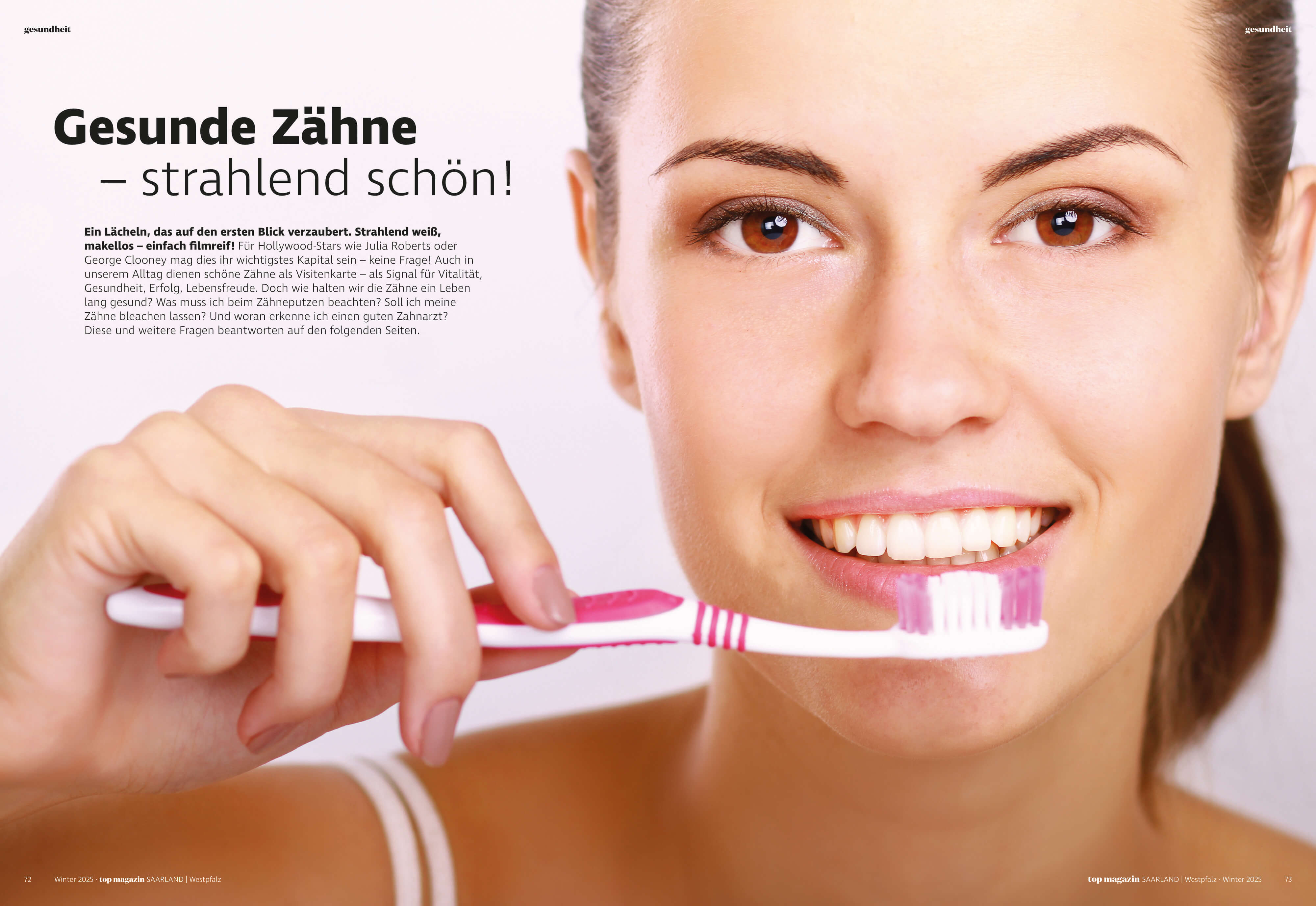 Ein Lächeln, das auf den ersten Blick verzaubert. Strahlend weiß, makellos - einfach filmreif! Für Hollywood-Stars wie Julia Roberts oder George Clooney mag dies ihr wichtigstes Kapital sein - keine Frage! Auch in unserem Alltag dienen schöne Zähne als Visitenkarte - als Signal für Vitalität, Gesundheit, Erfolg, Lebensfreude. Doch wie halten wir die Zähne ein Leben lang gesund? Was muss ich beim Zähneputzen beachten? Soll ich meine Zähne bleachen lassen? Und woran erkenne ich einen guten Zahnarzt? Diese und weitere Fragen beantworten auf den folgenden Seiten.