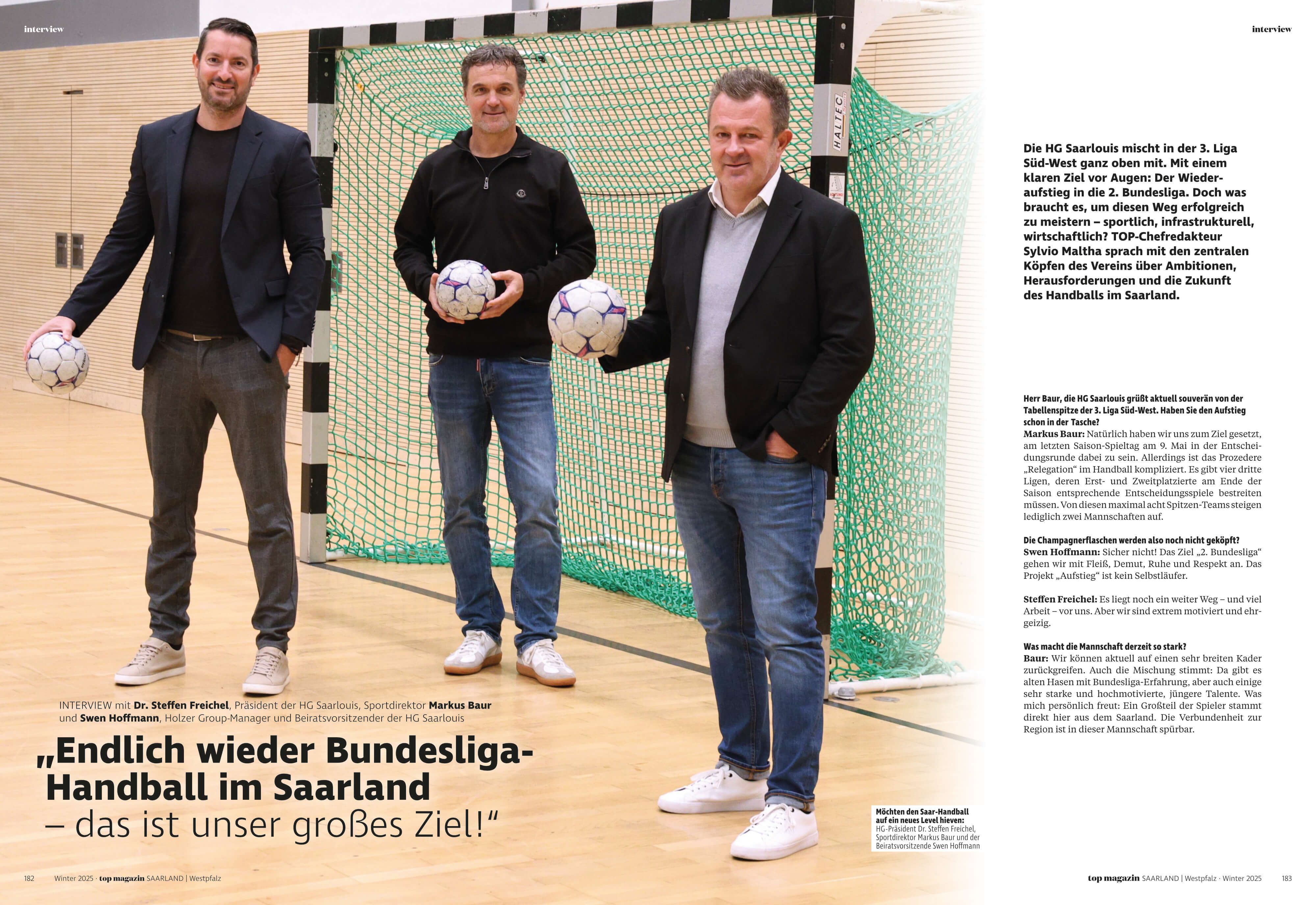 Die HG Saarlouis mischt in der 3. Liga Süd-West ganz oben mit. Mit einem klaren Ziel vor Augen: Der Wiederaufstieg in die 2. Bundesliga. Doch was braucht es, um diesen Weg erfolgreich zu meistern - sportlich, infrastrukturell, wirtschaftlich? TOP-Chefredakteur Sylvio Maltha sprach mit den zentralen Köpfen des Vereins über Ambitionen, Herausforderungen und die Zukunft des Handballs im Saarland.